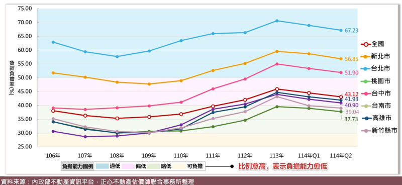 正心不動產估價師聯合事務所協理陳孟筠指出,單看房價所得比容易產生誤導,若對照「貸款負擔率」指標,台中市仍高達51.90%,處於「負擔能力過低」等級。